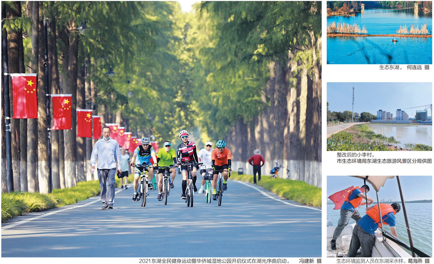 建成全长102公里的东湖绿道,将全湖128.22公里岸线全部纳入保护,东湖成为市民亲近自然的城市生态绿心。