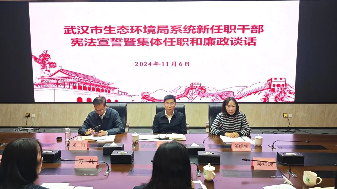 11月6日,市生态环境局组织开展新任职干部宪法宣誓暨集体任职和廉政谈话。党组书记、局长张朝辉,市纪委监委派驻市政协机关纪检监察组副组长邬帼俊监誓并讲话,党组成员、副局长张颉主持,全体新任职干部参加活动。