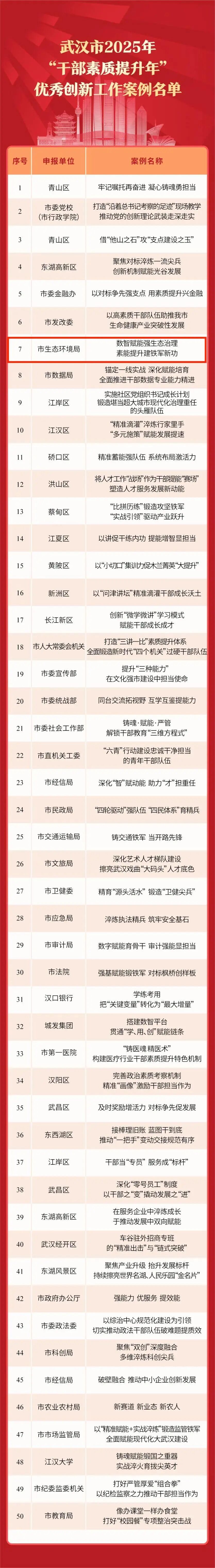 去年以来,省委部署开展“干部素质提升年”。武汉市深入贯彻落实省委部署要求,将提升干部能力素质作为2025年全市组织工作的主题主线。全市上下迅速响应、积极作为,持续增强干部支点意识、争先意识、效率意识、为民意识、能力意识,大力提振干部队伍“四气”精神,展现出锐意进取、奋勇争先的良好风貌。在扎实推进“六大行动”过程中,我市各区各单位探索了不少行之有效的实践做法和先进经验,形成了一批有特色、有亮点、可复制、可推广的创新工作案例。经严格评审,确定50个优秀创新工作案例。