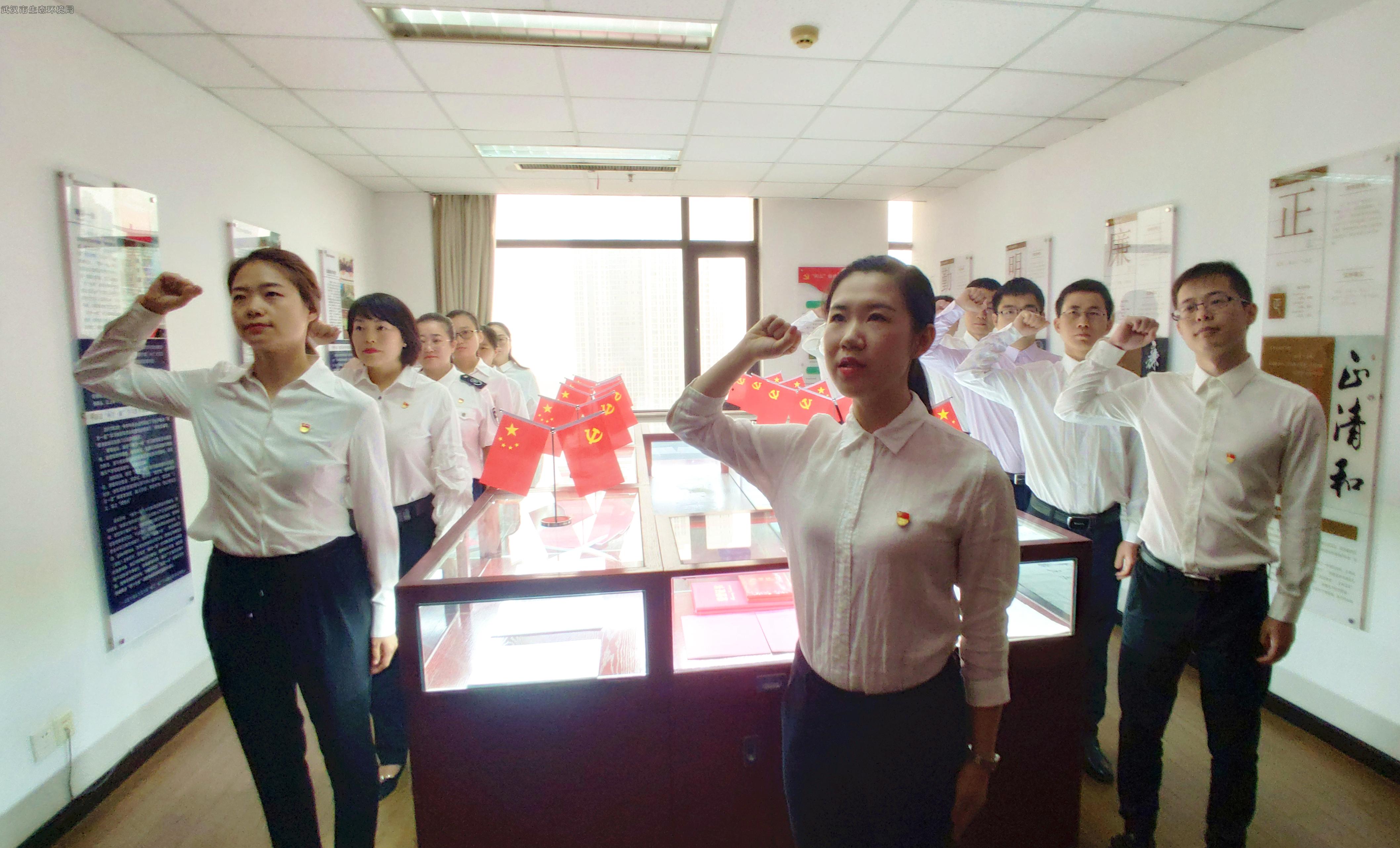 与此同时,14楼廉政陈列室传来了嘹亮的《国际歌》的声音,市生态环境局2013年以来发展党员面向党旗,高举右手,老党员重温了誓词,预备党员作出了承诺,大家胸前的党徽在阳光中也熠熠生辉。