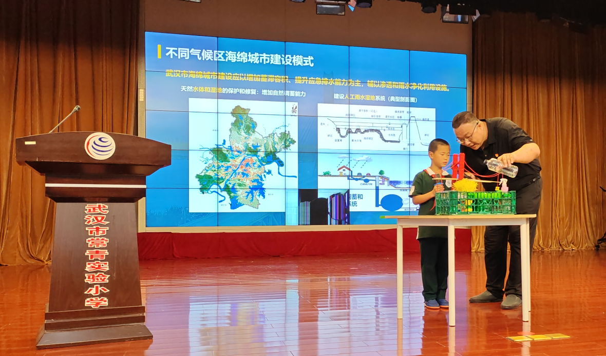 宣讲活动中,还出现了一位不到10岁的小小生态环境讲解员身影,他是来自一年级3班的王韬凯同学,他的海绵城市环保作品今年参加了武汉市第二十届青少年生态环境实践活动中无废校园主题比赛,听说徐博士团队要来讲海绵城市,他主动报名要来和专家现场“比试”下。两位生态环境讲解员共同为师生们献上了一场精彩的“海绵宝宝校园大PK”。