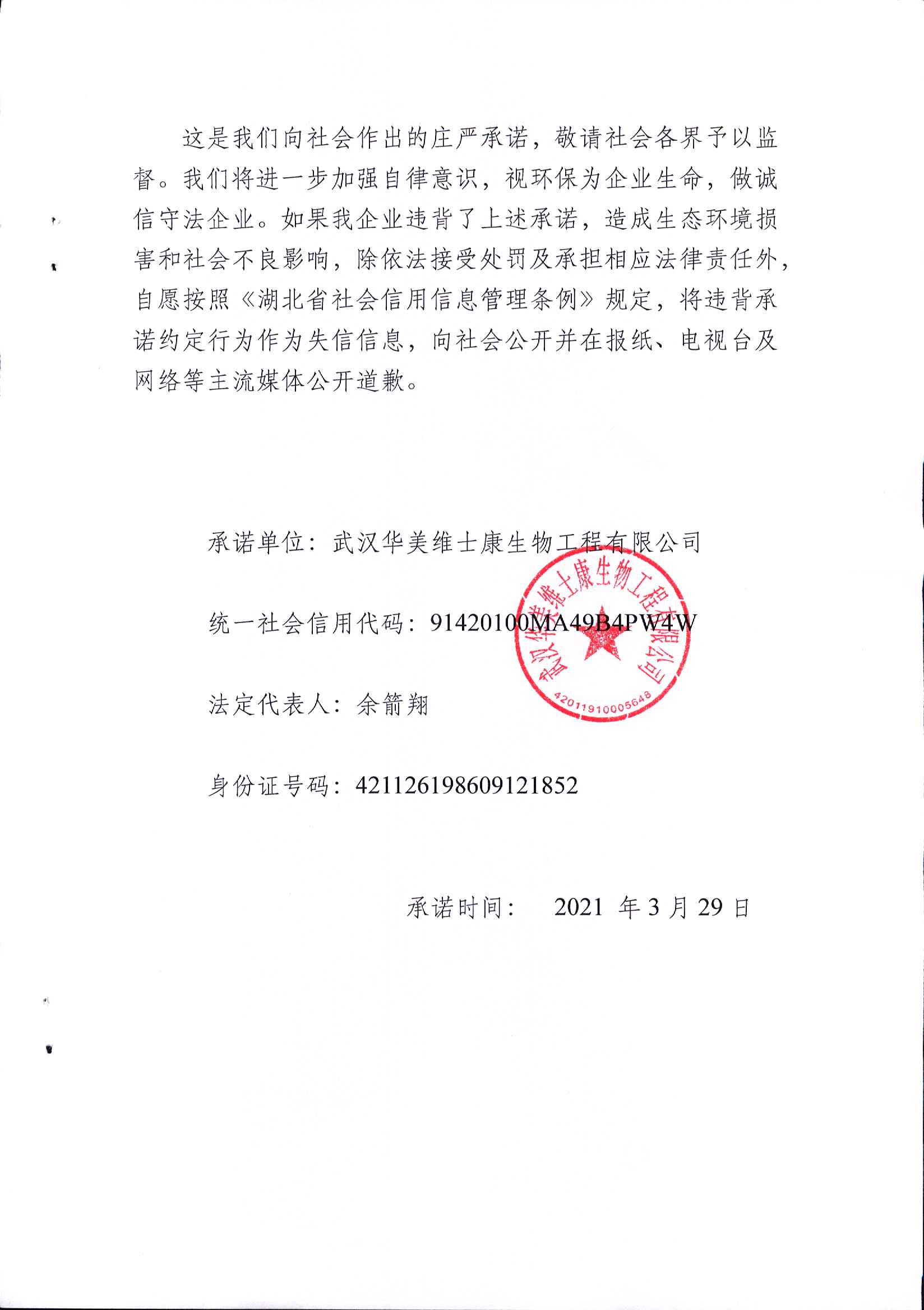 武汉华美维士康生物工程有限公司信用承诺书