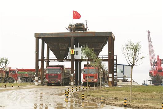 昨日,江夏区金港新区严家村江堤外550米岸线上,武汉市首个砂石临时码头正繁忙运转。运砂船上的砂石料,经过皮带机传送到货场的料斗,车辆装填后关上密封篷布,驶入洗车槽,洗净车体后,方才离场。货场内,一台洒水车正在对道路进行降尘作业。