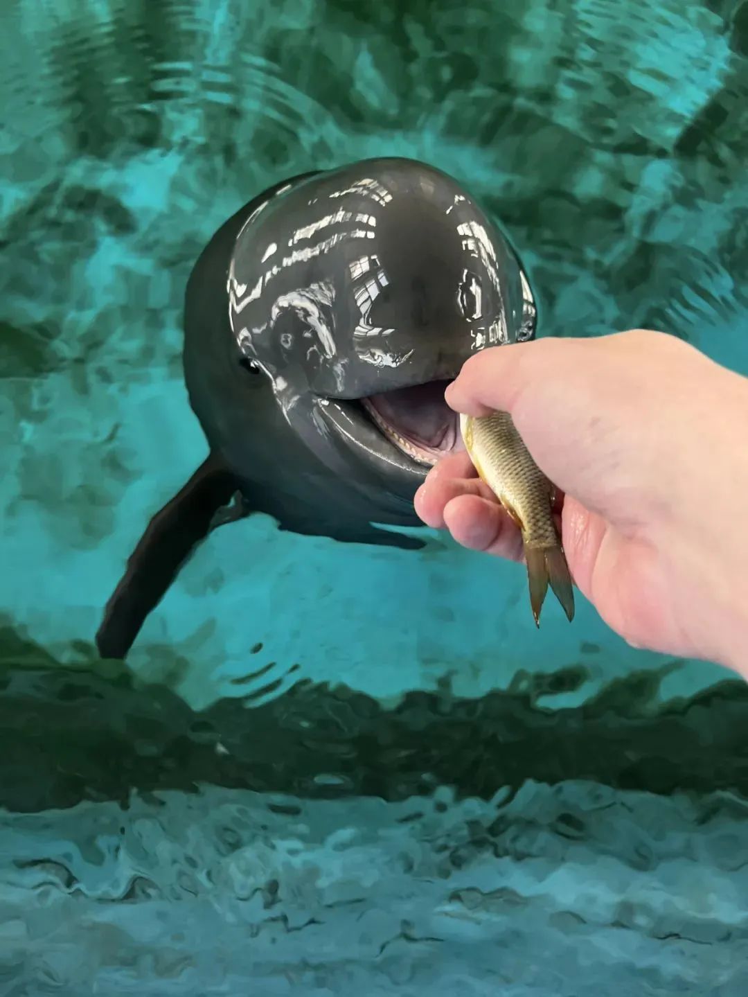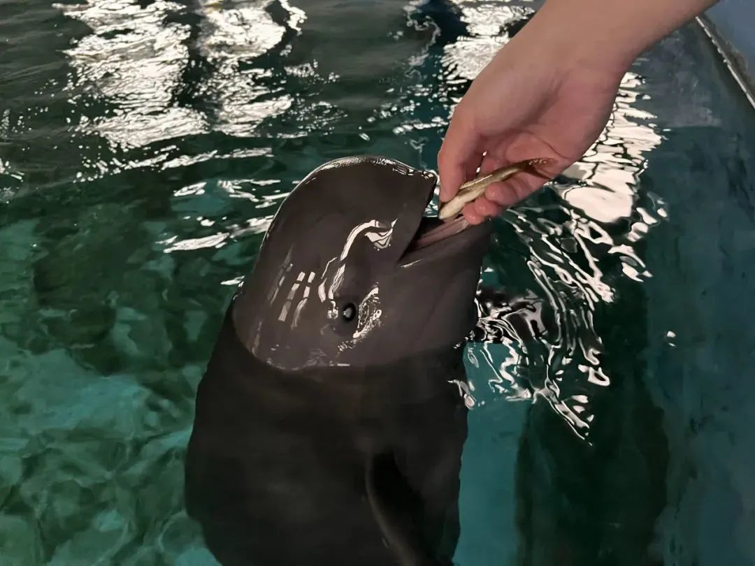 “小久久”出生时体重6.5公斤,体长70厘米,现在体重35公斤,体长1.1米。不仅是捕捉活鱼的小能手,还会配合训练员吃添加有各种营养元素的冰鲜饵料鱼,每天的进食量能稳定达到两公斤。