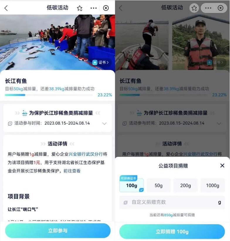“武碳江湖”开创了减排量配捐新模式,在本次活动期间,用户每捐赠1g减排量,将由兴业银行武汉分行为“长江有鱼”项目定向配捐1元,用于支持湖北省长江生态保护基金会开展长江珍稀鱼类保护。通过以“碳”代捐的方式,本次公益项目不仅可以得到兴业银行武汉分行的支持,用户捐赠的减排量也将进入长江生态保护基金会碳账户,可用于中和基金会日常运营产生的排放。