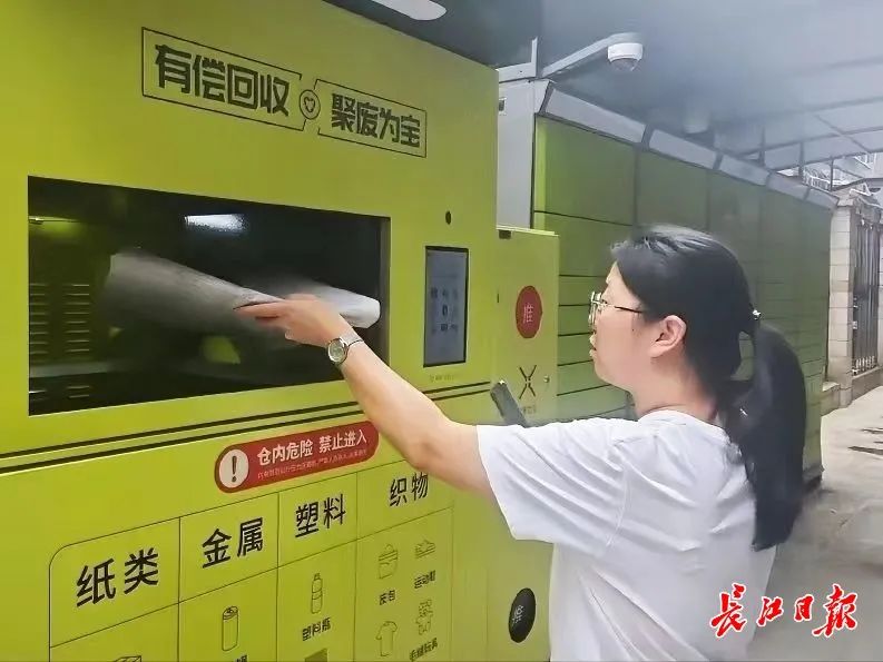 居民阮女士将一包可回收垃圾投入小区门口的智能回收机后,机器自动识别并称重,现金即时返到手机上。