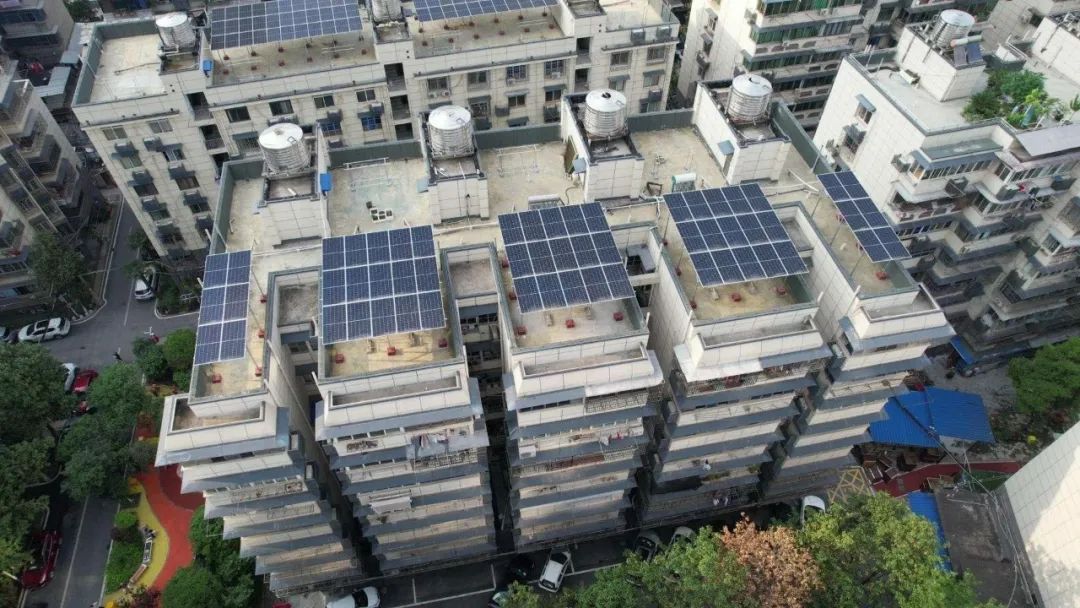 站在广发大厦的高层俯看,新华小区居民楼的屋顶铺满了光伏板。