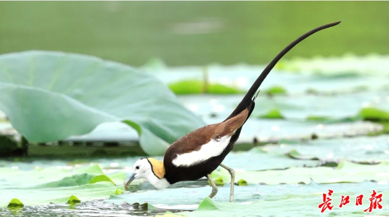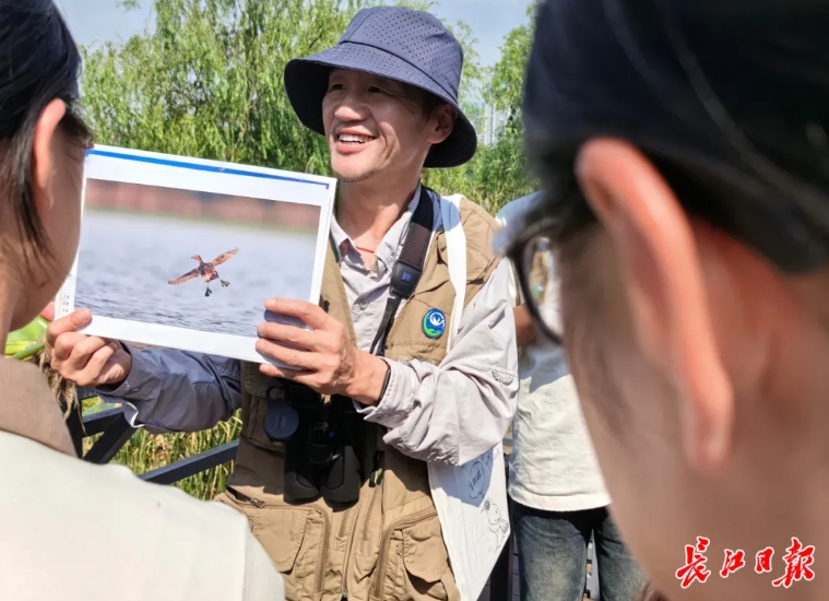 “同学们,观鸟志愿者今年在这里发现了国家二级保护野生动物——水雉。”9月25日,在东湖旅游风景区白马驿站的一处水湾,武汉市观鸟协会会长颜军指着不远处一片荷塘,向湖北美术学院实验艺术学院的同学们介绍。“这种鸟很漂亮。你们今后可以借鉴它的形象、羽色来进行美术创作,宣传咱们东湖的生态之美。”
