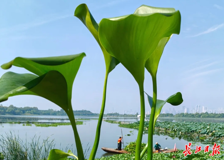水湾一侧,容天喜、李良港等工作人员正在打捞清理漂浮在水面的水葫芦,并装船运走。东湖文旅的旅联物业工作人员郑赞介绍,这些水葫芦又名凤眼莲,它们生长迅速,隔一段时间就要清运一次。