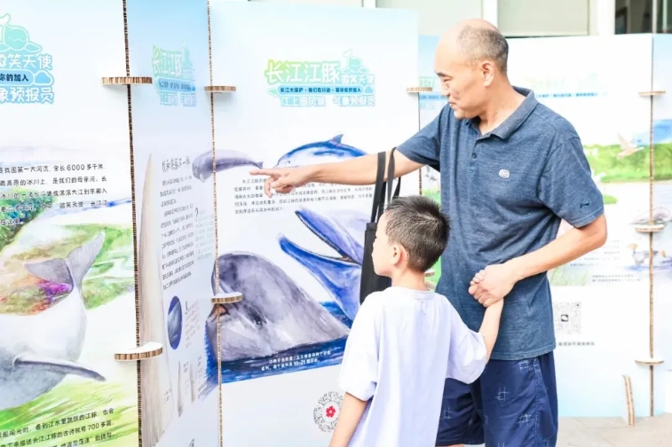 2024年全国生态日活动,群众在科普展板前了解江豚保护相关知识。