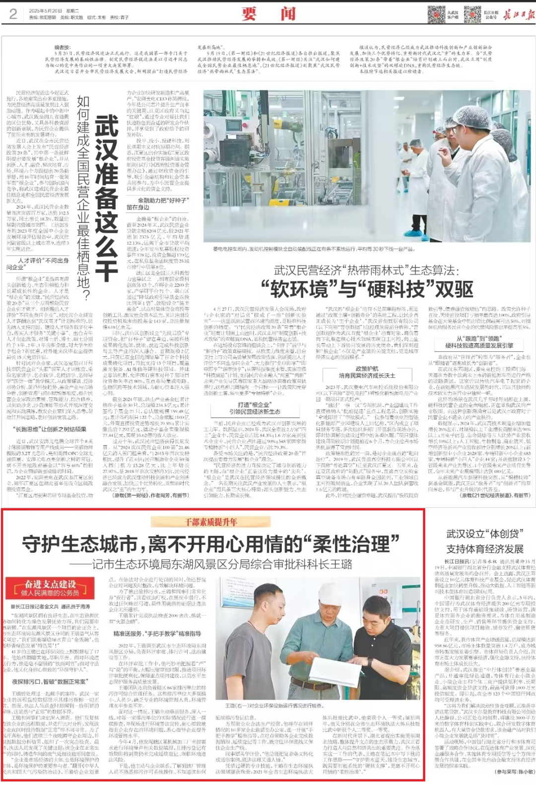 5月20日,长江日报《干部素质提升年·奋进支点建设 做人民满意的公务员》栏目刊发《守护生态城市,离不开用心用情的“柔性治理”》,聚焦我局2024年度优秀公务员典型市生态环境局东湖风景区分局综合审批科科长王璐同志,用文字描绘其“柔性治理”的“微画像”。武汉组工公众号予以转发。