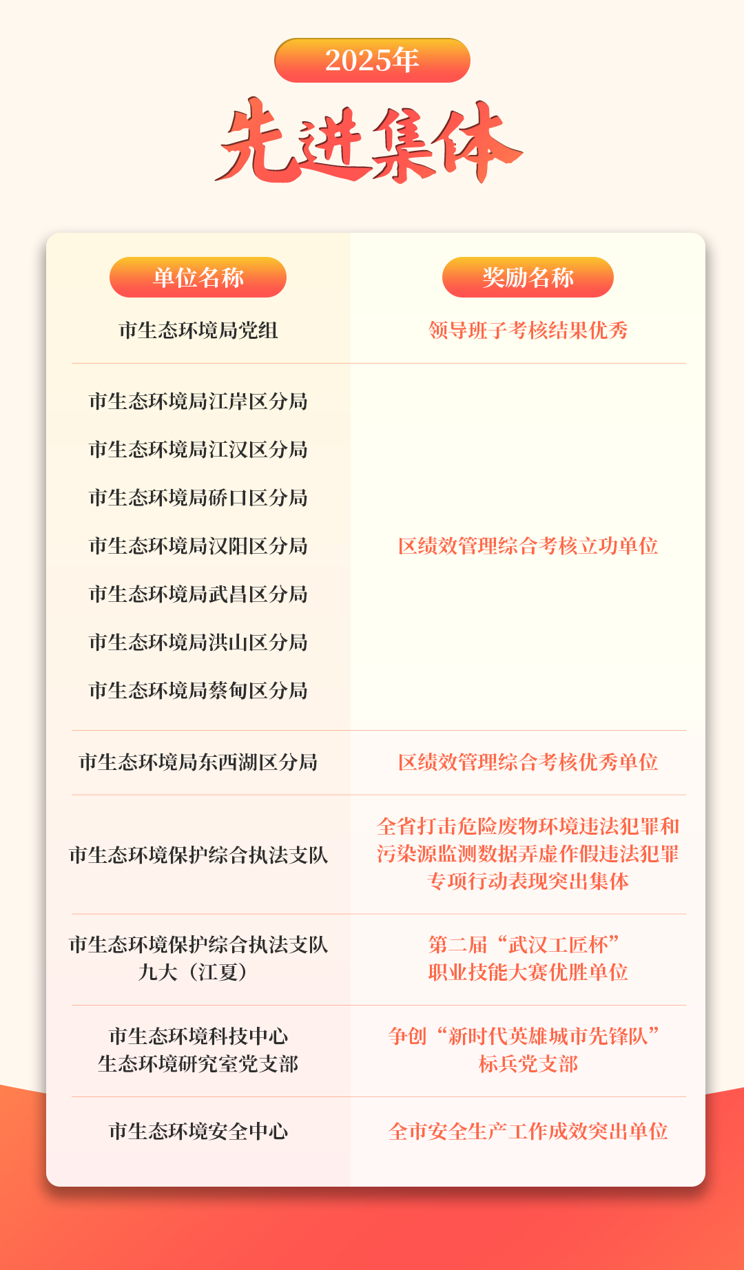 “干部素质提升年”实施以来,在先进典型的示范带动下,武汉市生态环境局系统各业务领域、各层级先进典型竞相涌现。13个集体获奖励获考评优秀,22名干部职工在环保专项业务领域获得奖励。