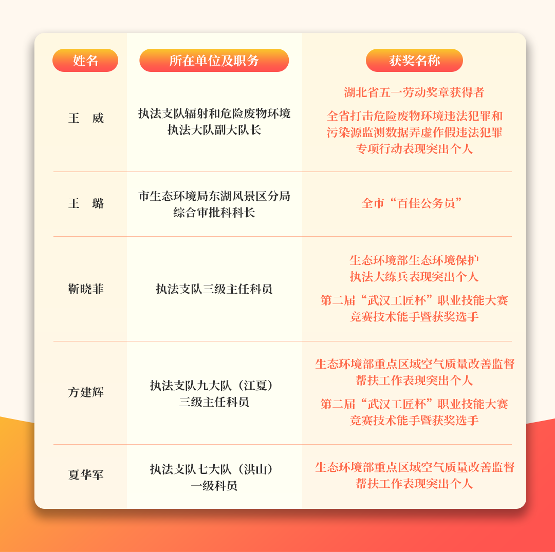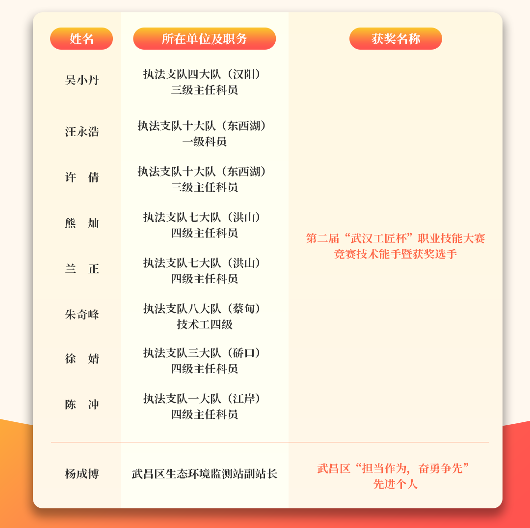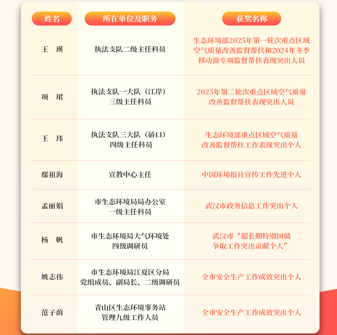 为深入推进“干部素质提升年”走深走实,切实发挥先进典型引领示范作用,激励广大干部在支点建设中奋勇争先、对标创优,武汉市生态环境局系统把发现培育先进典型融入日常工作,常态化设立“生态环保铁军风采专栏”,持续深入挖掘先进事迹,把长期奋战在生态环境保护基层一线、提升干部素质推动建设取得成绩的干部典型选树起来,为建设美丽中国先行区、奋力打造全国生态环境保护新高地提供人才支撑。