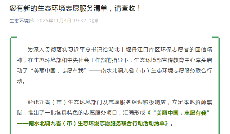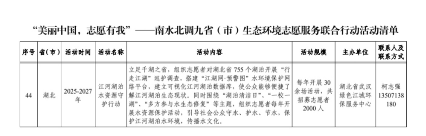 近日,生态环境部官微发布《“美丽中国,志愿有我”——南水北调九省(市)生态环境志愿服务联合行动活动清单》,该活动由生态环境部宣传教育中心牵头启动,清单共收录60项内容丰富、形式多样的生态环境志愿服务活动。其中,武汉有2项行动入选,分别是“江河湖泊水资源守护行动”和“武汉生态环保高校行”志愿服务活动。