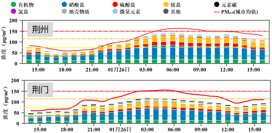 25日14时至26日16时荆州组分站、荆门超级站组分重构与PM2.5浓度值变化。