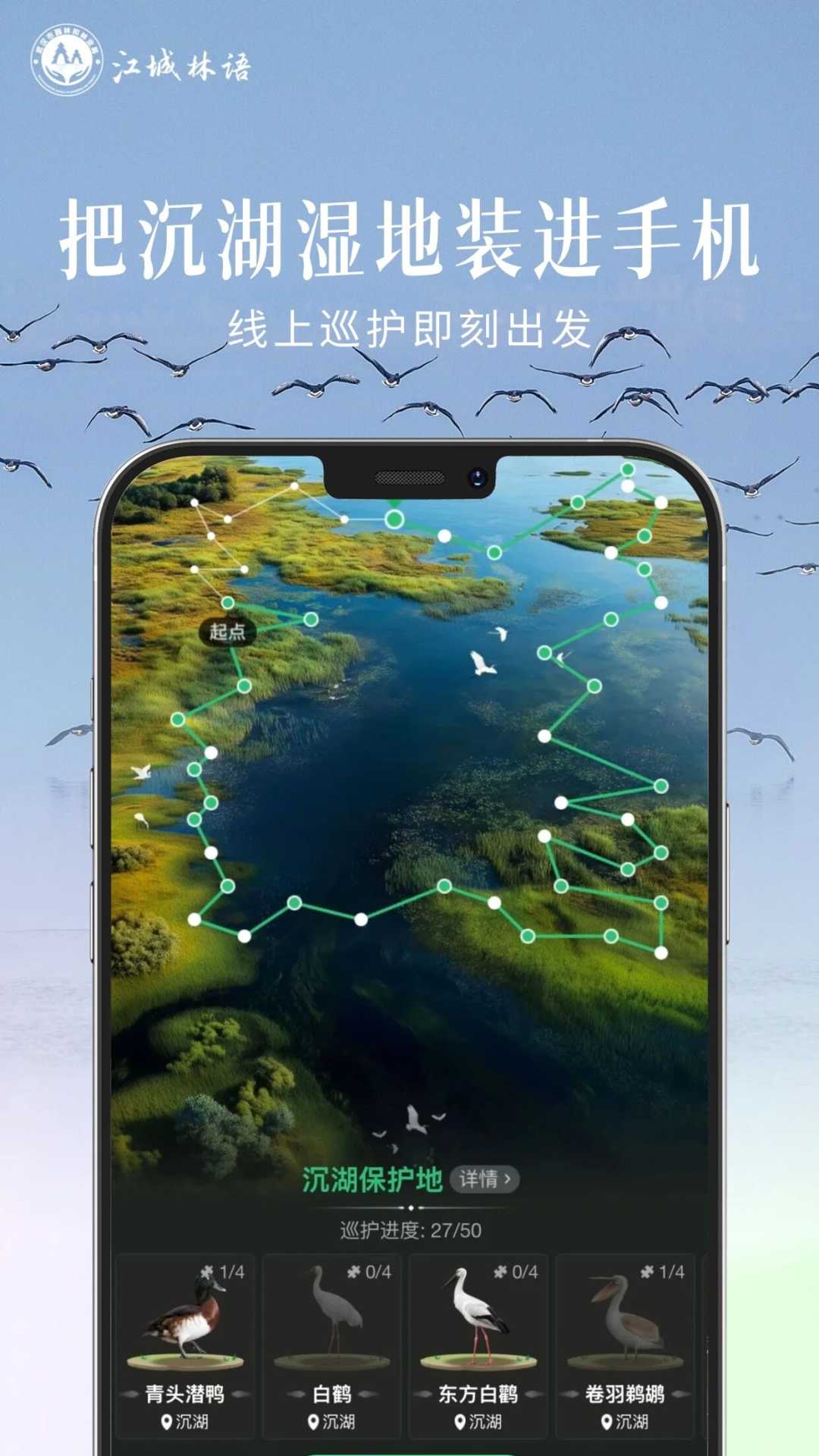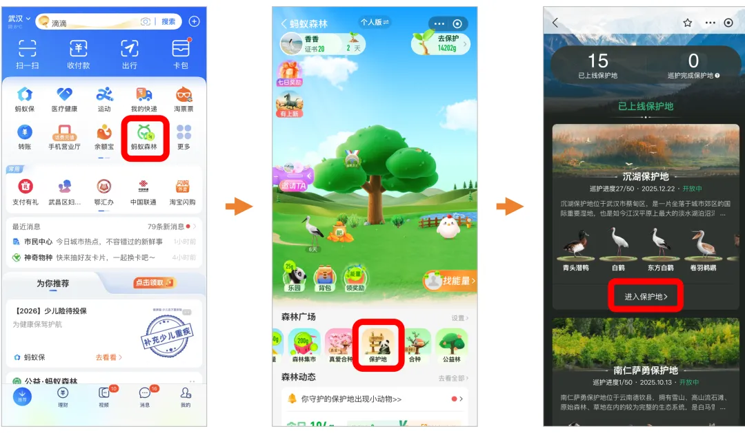 打开支付宝进入蚂蚁森林,在“森林广场”找到“保护地”,点击进入“沉湖保护地”,选择“开始巡护”,就能沉浸式打卡湿地、云游自然了!
