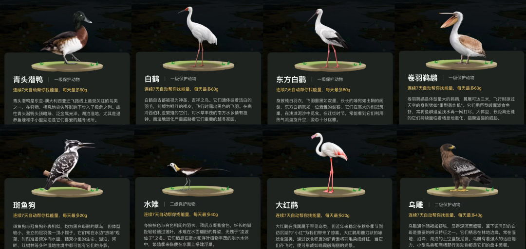 候鸟家园,云巡护。沉湖湿地是武汉唯一的国际重要湿地,也是东亚一澳大利西亚候鸟迁飞通道上的关键驿站,生物多样性极其丰富。为便于公众参与湿地保护,市民可通过蚂蚁森林在线巡护 “沉湖保护地”,将日常低碳小行动,变成守护候鸟天堂的大力量。