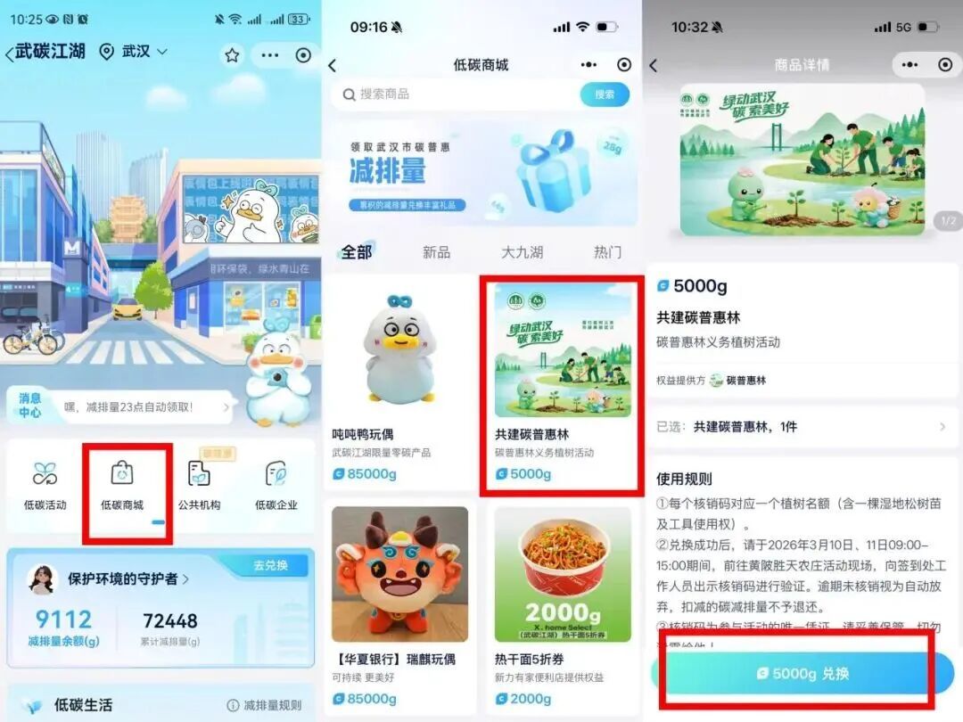 市民登录“武碳江湖”小程序后,日常骑行、乘坐地铁公交、节约用电所等低碳行为将自动转化为“减排量”,累计达到5000g后,就能在低碳商城兑换一株树苗,凭兑换记录可于指定时间前往“碳普惠主题林”线下活动点(黄陂区王家河街胜天村胜天农庄)参与植树。同时,企业也可通过认种树苗,助力“碳普惠主题林”建设。
