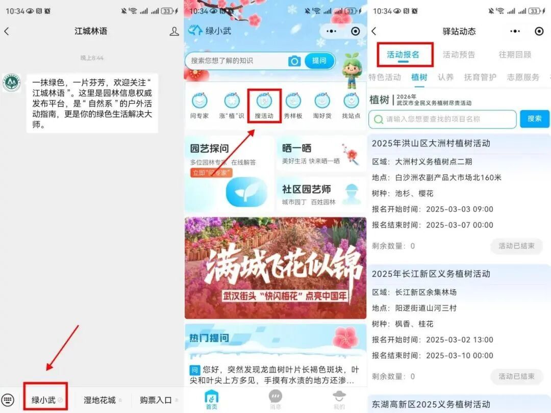 关注“江城林语”微信公众号,点击菜单栏 “绿小武” 服务选项进入小程序首页,再点“搜活动”即可浏览各类植树活动信息并选择场次报名。也可直接搜索 “绿小武” 小程序,查看活动列表完成报名。