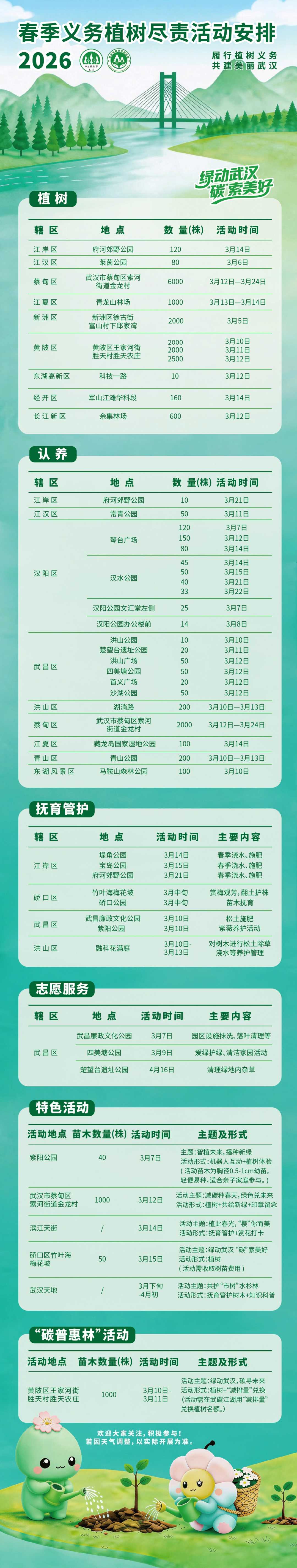 今年义务植树以“绿动武汉‘碳’索美好”为主题,构建全民义务植树尽责多元化场景:常规植树、志愿行动全都有;双线推进、群力共建主题林;科技助力、自然教育齐上线;云端公益、碳兑树苗玩不停。多形式解锁植树尽责,总有一款适合你!