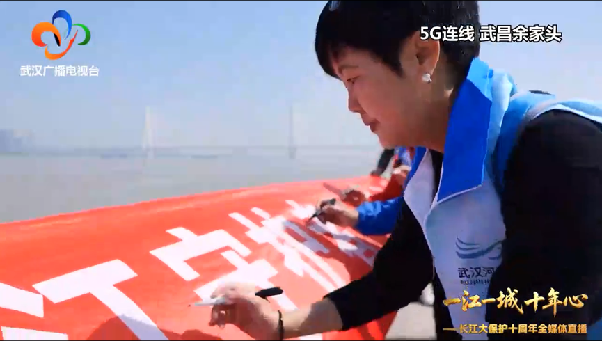 河湖长们在“长江守护者·十年之约”的旗帜上郑重签名。