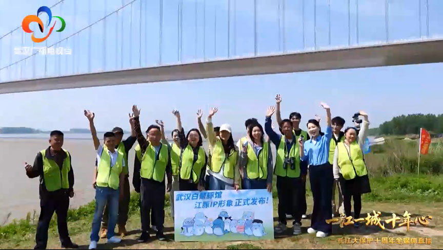 志愿者们举起以真实江豚为原型的吉祥物,对着镜头喊出:“江豚的微笑,我们来守护!”